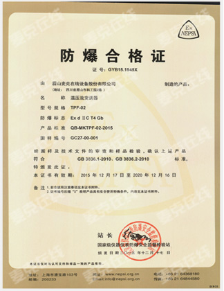 此次防爆證的取得充分表明了麥克在線自主研發(fā)的防爆在線連續(xù)分析儀、溫壓流變送器、防爆電加熱器研發(fā)水平在國(guó)內(nèi)的領(lǐng)先性,我公司也將繼續(xù)秉承“創(chuàng)新、務(wù)實(shí)”的企業(yè)精神,進(jìn)一步全方位提升產(chǎn)品開發(fā)能力和質(zhì)量水平。